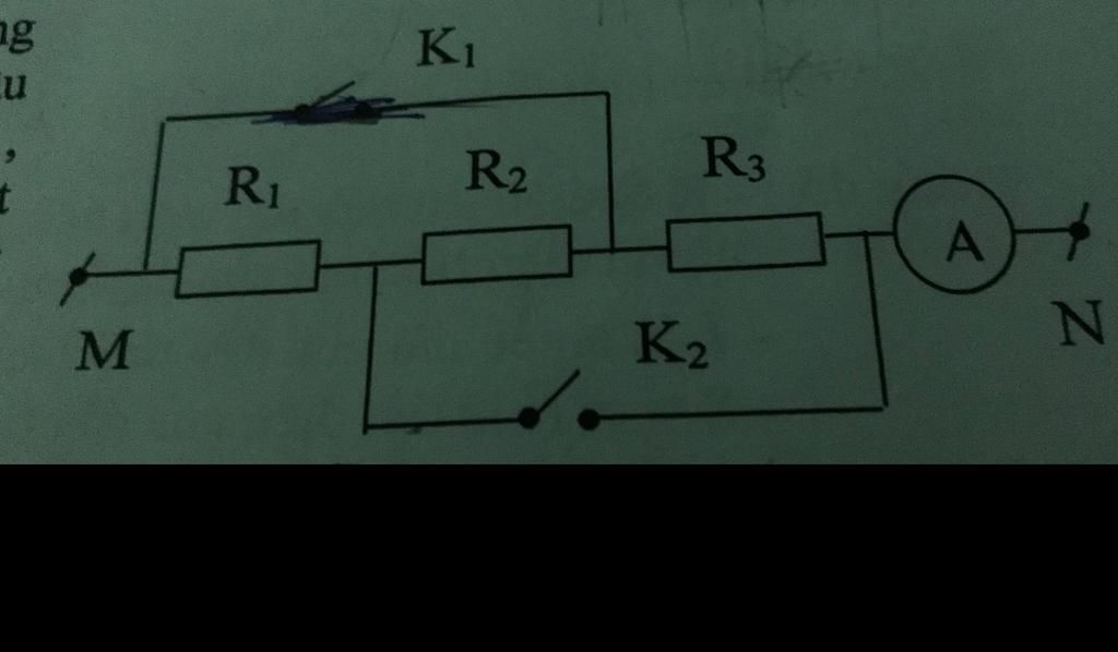 $K_{1}$, $K_{2}$ đều đóng: Mạch gồm $R_{1}$ // $R_{2}$ // $R_{3}$