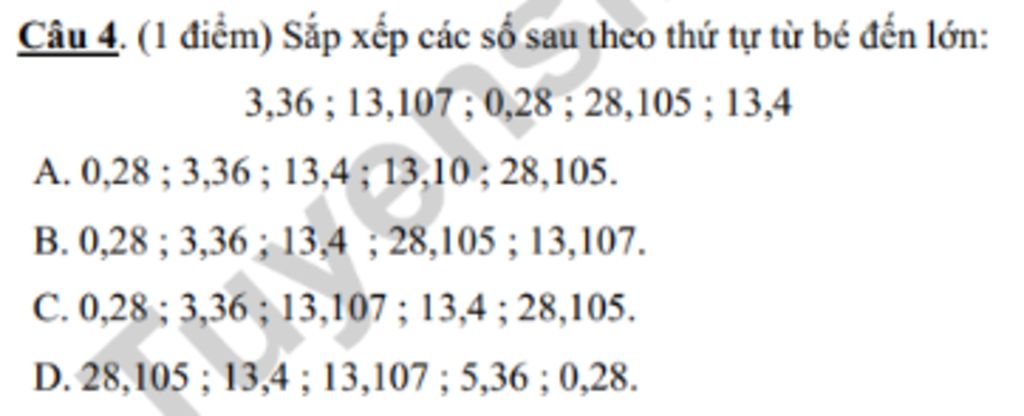 `=> 0,28 < 3,36 < 13,107<13,4 < 28,105`