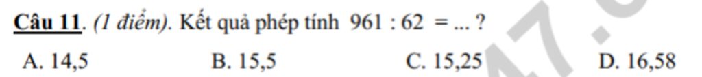 `\text{Ta có:}` `961 : 62 = 15,5`