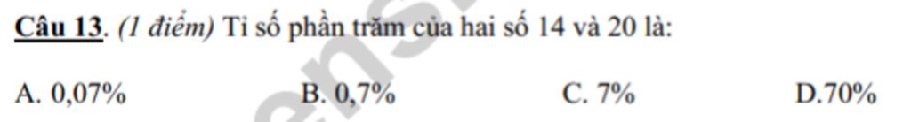 Tỉ số phần trăm của `14` vào `20` là `:`