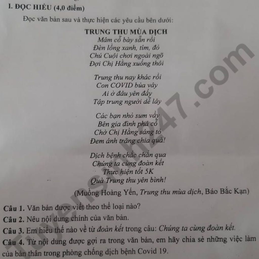 Câu 1. Văn bản trên được viết theo thể loại Ngũ ngôn tứ tuyệt.
