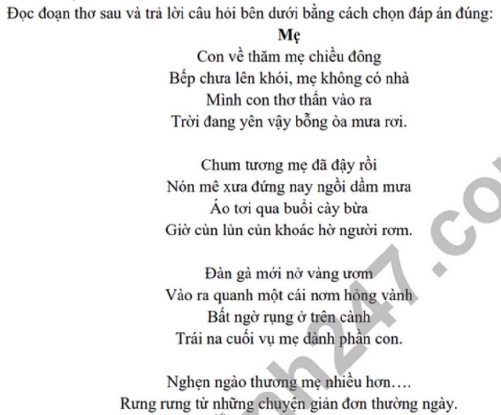 Đọc đoạn thơ sau và trả lời câu hỏi bên dưới bằng cách chọn đáp án đúng: