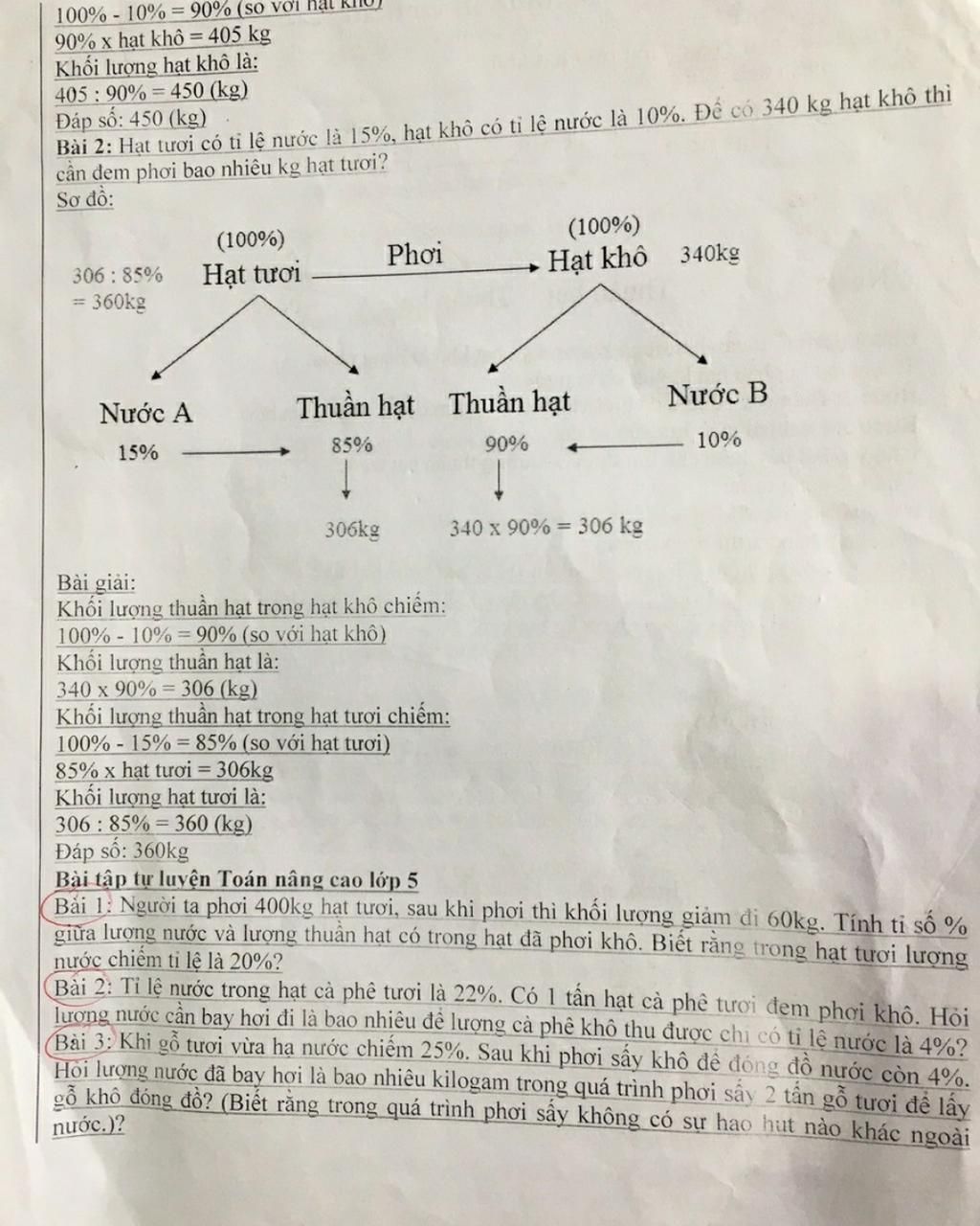 Bài 2: Hạt tươi có tỉ lệ nước là 15%, hạt khô có tỉ lệ nước là 10%. Để có 340 kg hạt khô thì
