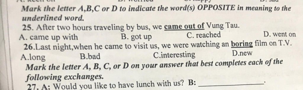 Mark the letter A,B,C or D to indicate the word(s) OPPOSITE in meaning to the