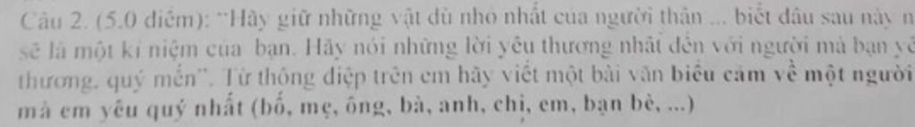Câu 2. (5,0 điểm): "Hãy giữ những vật dù nhỏ nhất của người thân ... biết đầu sau này nó sẽ là một kỉ niệm của bạn. Hãy nói những lời yêu thương nhất đến với người mà bạn về thương, quý mến". Từ thông điệp trên em hãy viết một bài văn biểu cảm về một người mà em yêu quý nhất (bố, mẹ, ông, bà, anh, chỉ, em, bạn bè, ...)