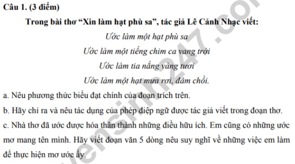 Câu 1. (3 điểm) Trong bài thơ “Xin làm hạt phù sa”, tác giả Lê Cảnh Nhạc viết: