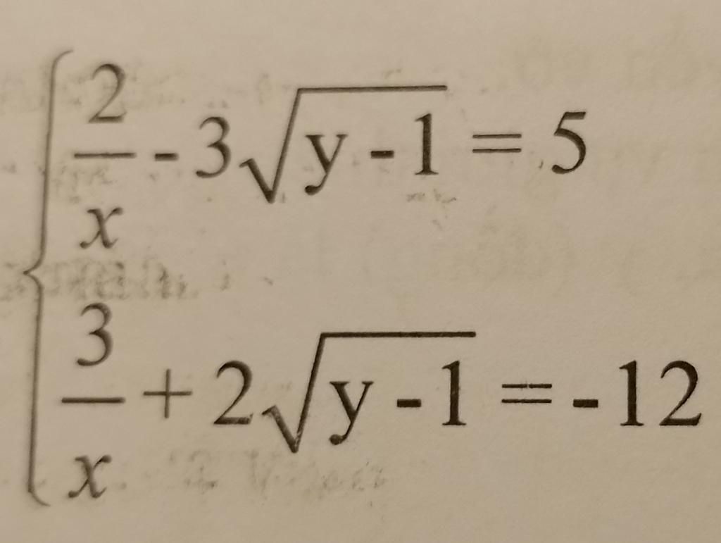 ㅤㅤ`{(2/x-3\sqrt{y-1}=5),(),(3/x-2\sqrt{y-1}=-12):}`$\\$$\\$ `=>``{(4/x-6\sqrt{y-1}=10),(),(9/x-6\sqrt{y-1}=-36):}`$\\$$\\$ `=>``{(4/x-6\sqrt{y-1}=10),(),(13/x=-26):}`$\\$$\\$ `=>``{(4/x-6\sqrt{y-1}=10),(),(x=-1/2):}`$\\$$\\$ `=>``{(4/(-1/2)-6\sqrt{y-1}=10),(),(x=-1/2):}`$\\$$\\$ `=>``{(\sqrt{y-1}=-3) ,(),(x=-1/2):}`$\\$$\\$ Vì `\sqrt{y-1}>=0 =>` hệ pt vô nghiệm