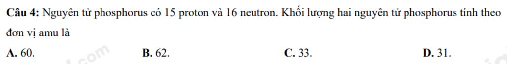 Số $\textit{p}$ = Sô $\textit{e}$ = $\text{15 }$hạt$\\$ Khối lượng 2 nguyên tử phosphorus tính theo đơn vị amu :$\\$ $m_nt$ $\approx$ $\text{2.(15 + 16 = 62(amu) }$$\\$ `->`$\text{B}$$\\$ $#hoangnam$