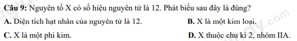 Câu 9: Nguyên tố X có số hiệu nguyên tử là 12. Phát biểu sau đây là đúng?
