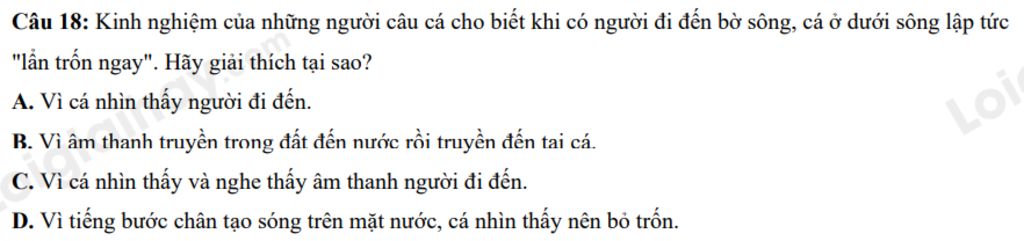 `⇒` `B.` Vì âm thanh truyền trong đất đến nước rồi truyền đến tai cá`.`
