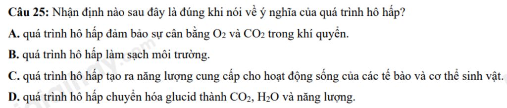 Câu `25:` Nhận định nào sau đây là đúng khi nói về ý nghĩa của quá trình hô hấp`?`