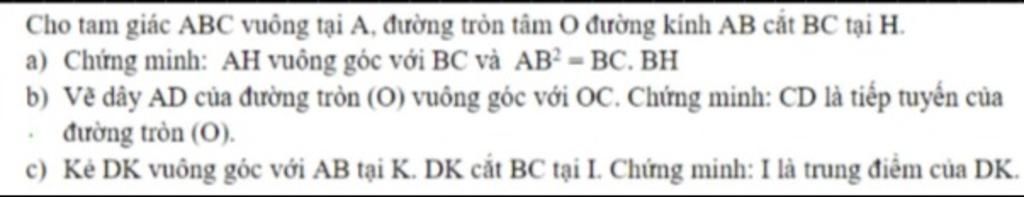 c) Kẻ DK vuông góc với AB tại K. DK cắt BC tại I. Chứng minh: ...
