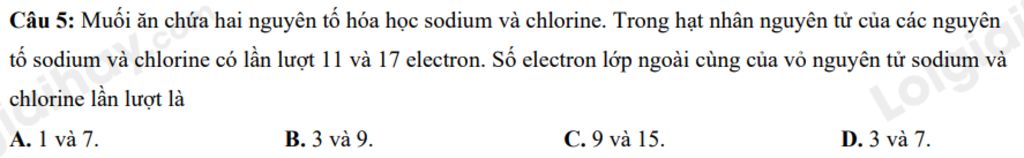 `=>` Số electron lớp ngoài cùng của vỏ nguyên tử sodium và chloride lần lượt là: