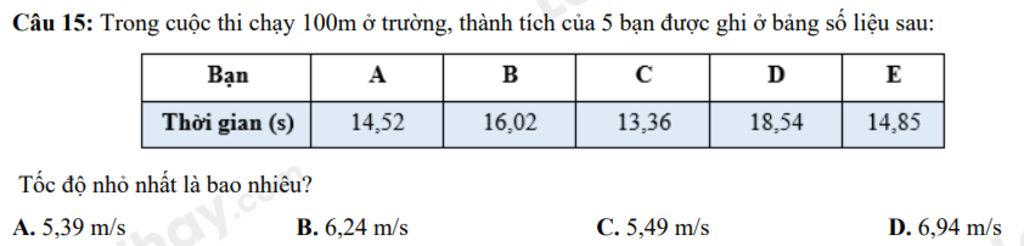 Câu 15: Trong cuộc thi chạy 100m ở trường, thành tích của 5 bạn được ghi ở bảng số liệu sau: Tốc độ nhỏ nhất là bao nhiêu?