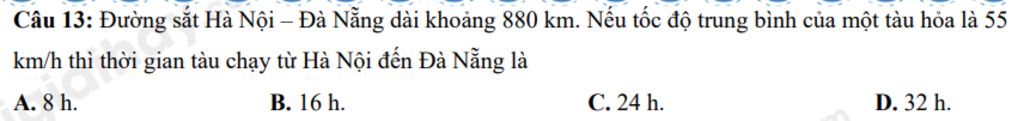 Câu 13: Đường sắt Hà Nội – Đà Nẵng dài khoảng 880 km. Nếu tốc độ trung bình của một tàu hỏa là 55km/h thì thời gian tàu chạy từ Hà Nội đến Đà Nẵng là