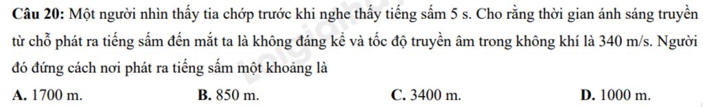 Câu 20: Một người nhìn thấy tia chớp trước khi nghe thấy tiếng sấm 5 s. Cho rằng thời gian ánh sáng truyền từ chỗ phát ra tiếng sấm đến mắt ta là không đáng kể và tốc độ truyền âm trong không khí là 340 m/s. Người đó đứng cách nơi phát ra tiếng sấm một khoảng là