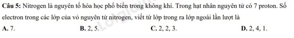 Câu 5: Nitrogen là nguyên tố hóa học phổ biến trong không khí. Trong hạt nhân nguyên tử có 7 proton. Số electron trong các lớp của vỏ nguyên tử nitrogen, viết từ lớp trong ra lớp ngoài lần lượt là