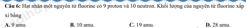 Câu 6: Hạt nhân một nguyên tử fluorine có 9 proton và 10 neutron. Khối lượng của nguyên tử fluorine xấp xỉ bằng