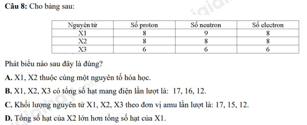 `C.` Khối lượng nguyên tử `X1, X2, X3` theo đơn vị $amu$ lần lượt là `:` `17, 15, 12 .`