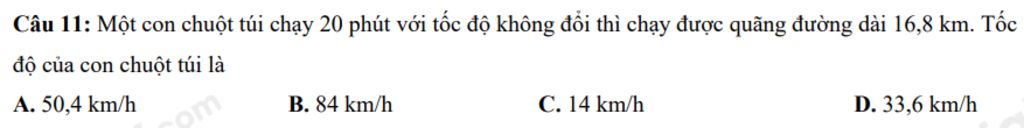 Câu `11:` Một con chuột túi chạy `20` phút với tốc độ không đổi thì chạy được quãng đường dài `16,8 km.` Tốc độ của con chuột túi là :