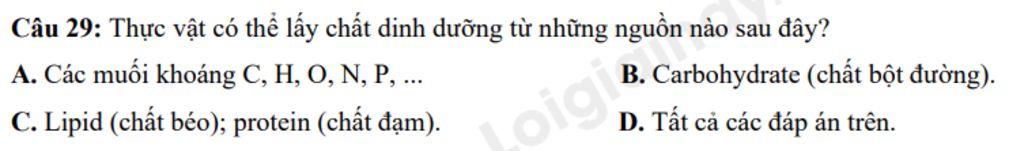 Câu 29: Thực vật có thể lấy chất dinh dưỡng từ những nguồn nào sau đây?