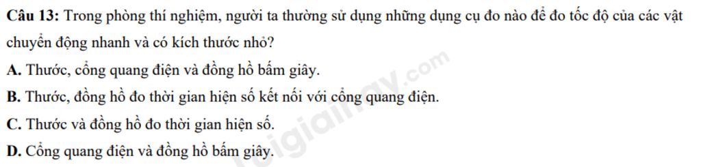 `13:` Trong phòng thí nghiệm, người ta thường sử dụng những dụng cụ đo để đo tốc độ của các vật là`:`