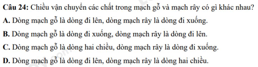 Câu 24: Chiều vận chuyển các chất trong mạch gỗ và mạch rây có gì khác nhau?