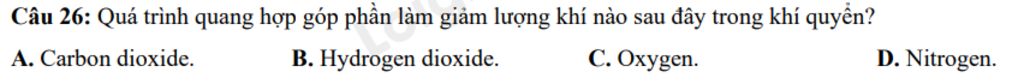 Quá trình quang hợp góp phần làm giảm lượng khí: A. Carbon dioxide