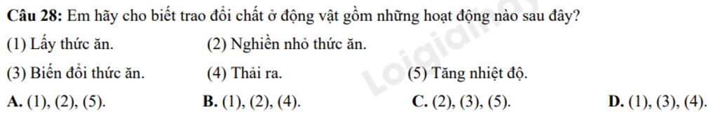Các hoạt động trong quá trình trao đổi chất ở động vật là: Lấy thức ăn, Biến đổi thức ăn, thải ra ngoài