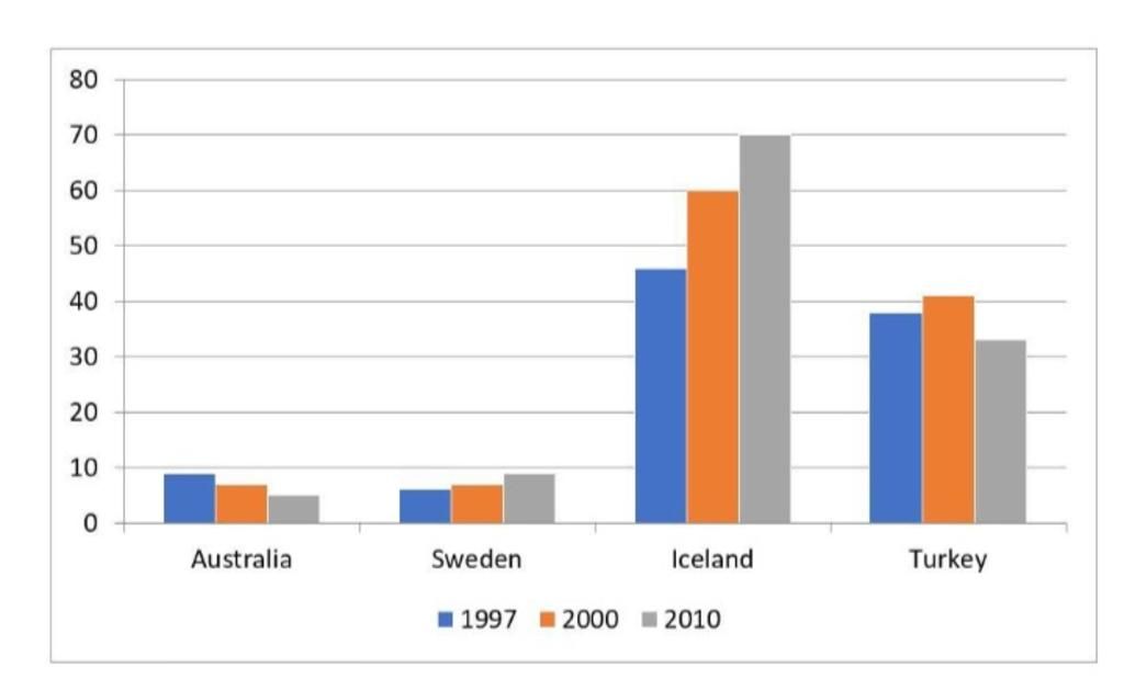 4. Levels of pollution in Australia, Sweden, and Iceland followed a steady pattern each year. They continuously went up or down between the study periods. In Turkey, however, pollution numbers first increased between 1997 and 2000 before eventually experiencing a decrease in 2010.