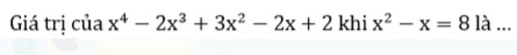 Vậy giá trị biểu thức `x^4-2x^3+3x^2-2x+2=90` tại `x^2-x=8`
