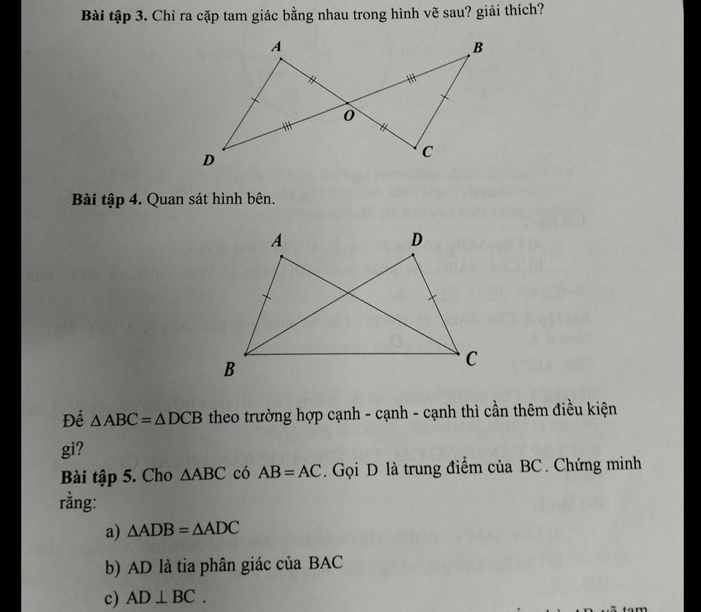 Bài tập 3. Chỉ ra cặp tam giác bằng nhau trong hình vẽ sau? giải thích?