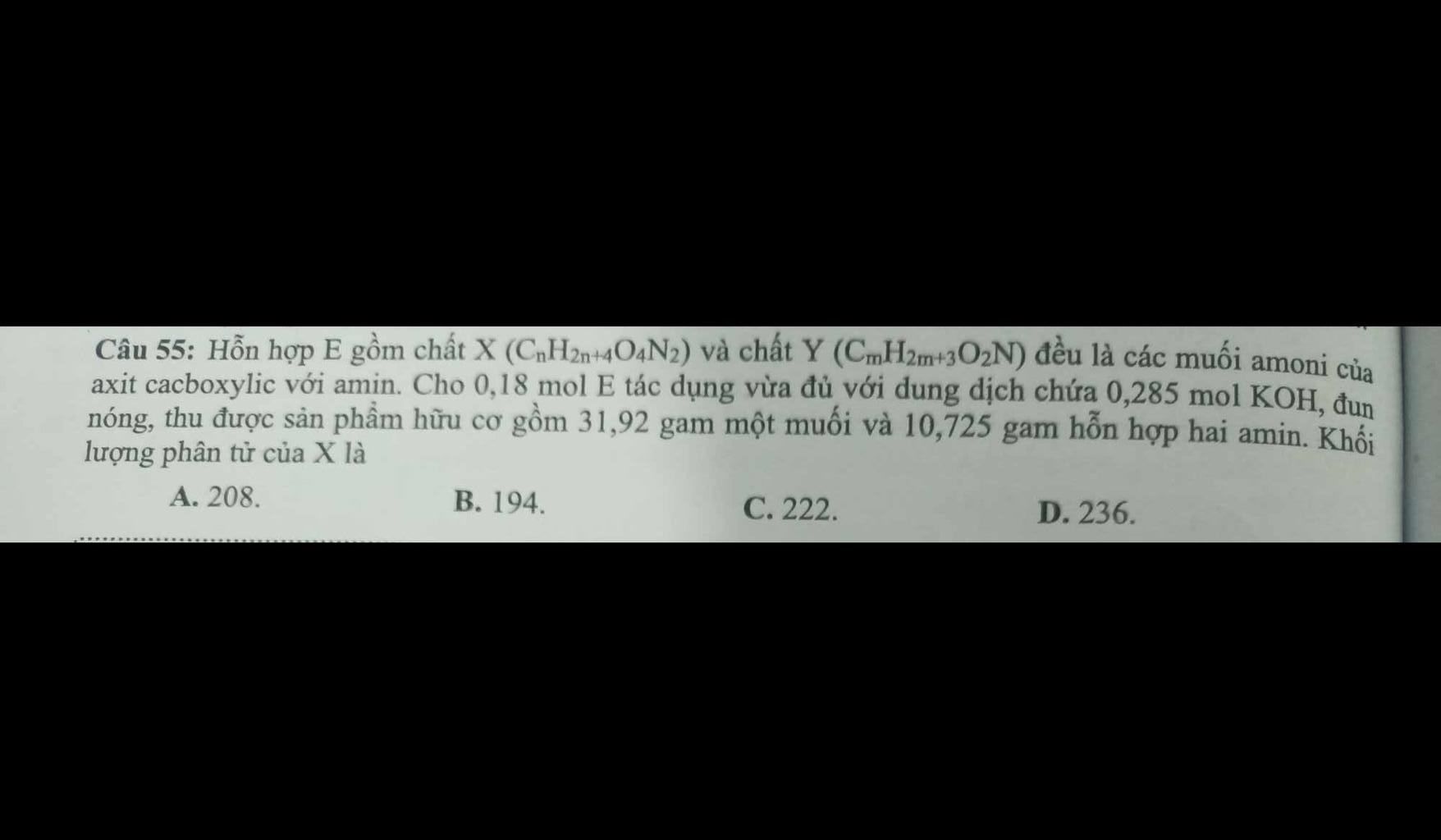 Câu 55: Hỗn hợp E gồm chất X (CnH2n+4O4Nz) và chất Y (CmH2m+3O2N) đều là các muối amoni của