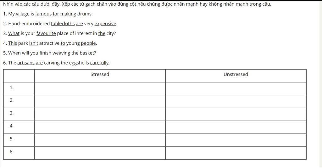 Nhìn vào các câu dưới đây. Xếp các từ gạch chân vào đúng cột nếu chủng được nhấn mạnh hay không nhấn mạnh trong câu.