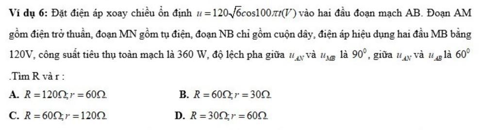 Ví dụ 6: Đặt điện áp xoay chiều ổn định u=120|6cos100#t(V) vào hai đầu đoạn mạch AB. Đoạn AM