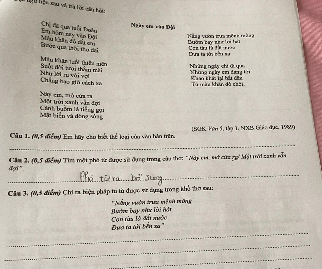 `-` Thể loại của văn bản ''Ngày em vào đội'' là : thể thơ `5` chữ