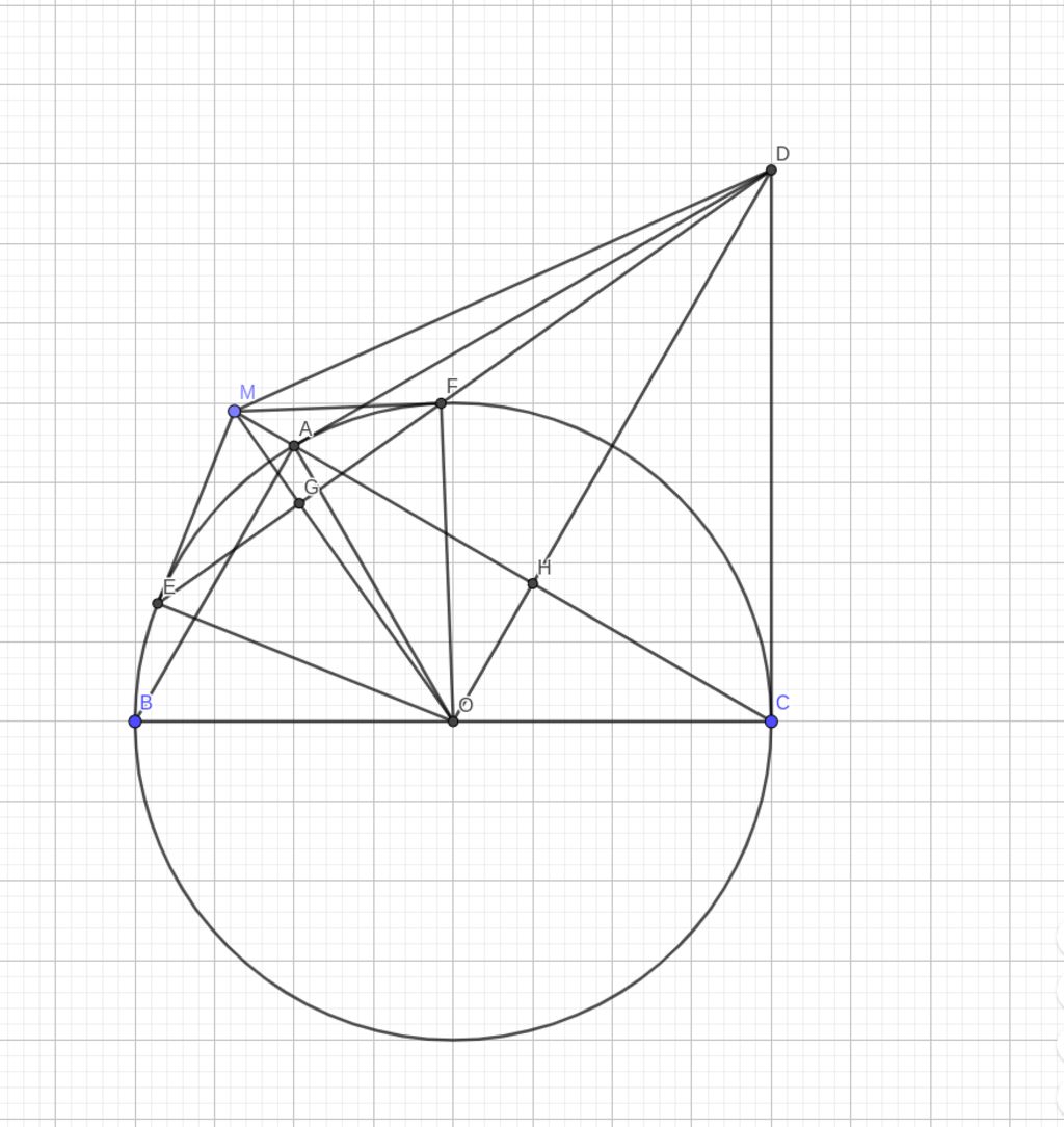 Vì $ME, FM$ là tiếp tuyến của $(O)\to MO\perp EF=G$ là trung điểm $EF, MF\perp FO, ME\perp EO$