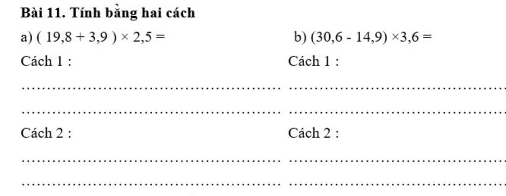 a. Cách 1: ( 19,8 + 3,9 ) x 2,5 Cách 2: ( 19,8 + 3,9 ) x 2,5