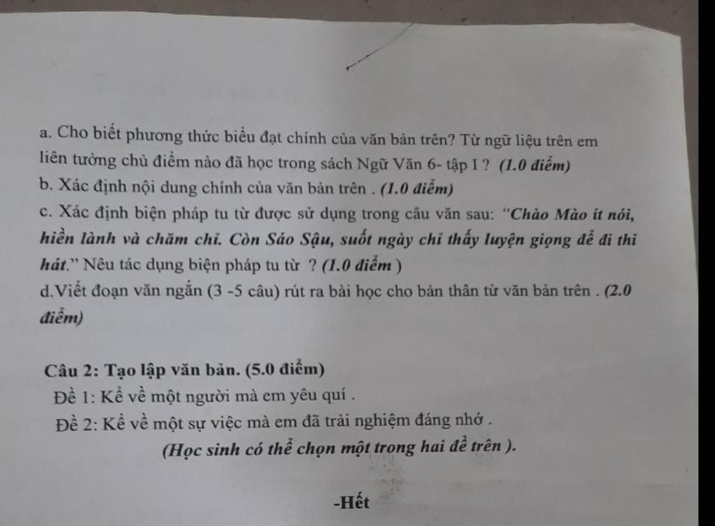 liên tưởng chủ điểm nào đã học trong sách Ngữ Văn 6- tập I ? (1.0 điểm)