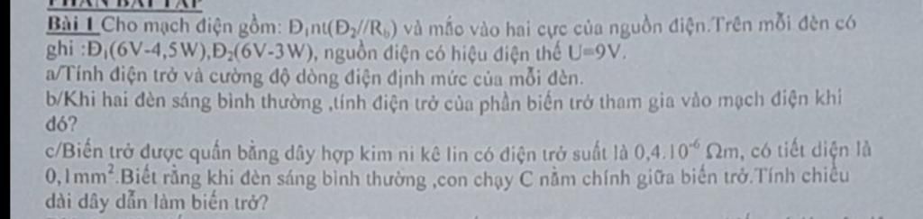 Bài I Cho mạch điện gồm: Đ,nt(Đ,//R,) và mắc vào hai cực của nguồn điện.Trên mỗi đèn có