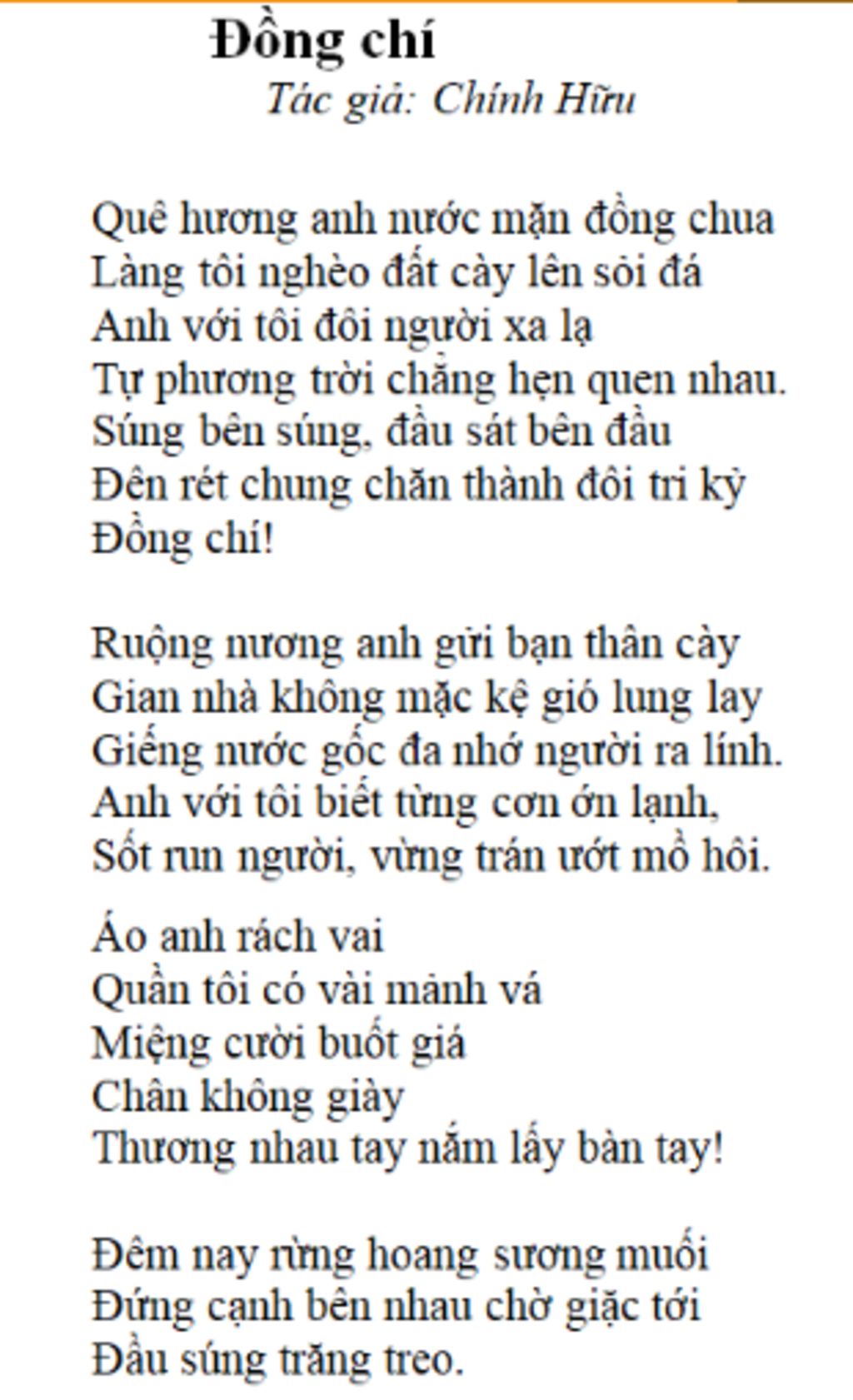 Người lính nông dân, như một lẽ tự nhiên đã đi vào biết bao bài thơ trong văn học Việt Nam. Hình ảnh của họ hiện lên thật giản dị, gần gũi như Nhớ của Hồng Nguyên, Cá nước của Tố Hữu,… và cũng nằm trong mạch chung ấy, ta không thể không nhắc đến Đồng chí của Chính Hữu. Bài thơ là bài ca ca ngợi tình cảm đồng chí, đồng đội tha thiết, sâu nặng trong hoàn cảnh chiến tranh ác liệt.