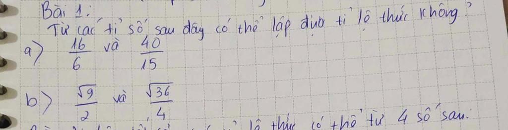 Vì `16/6=40/15` nên ta có thể lập được các tỉ lệ thức từ các tỉ số
