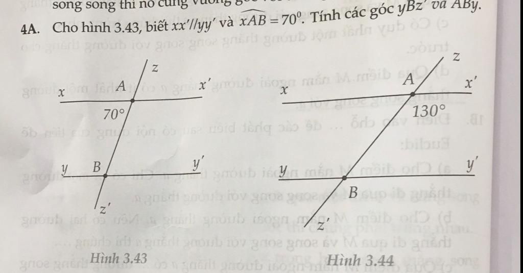 4A. Cho hình 3.43, biết xx’/lụy và xAB = 70. Tính các góc yBz' oa ABy.