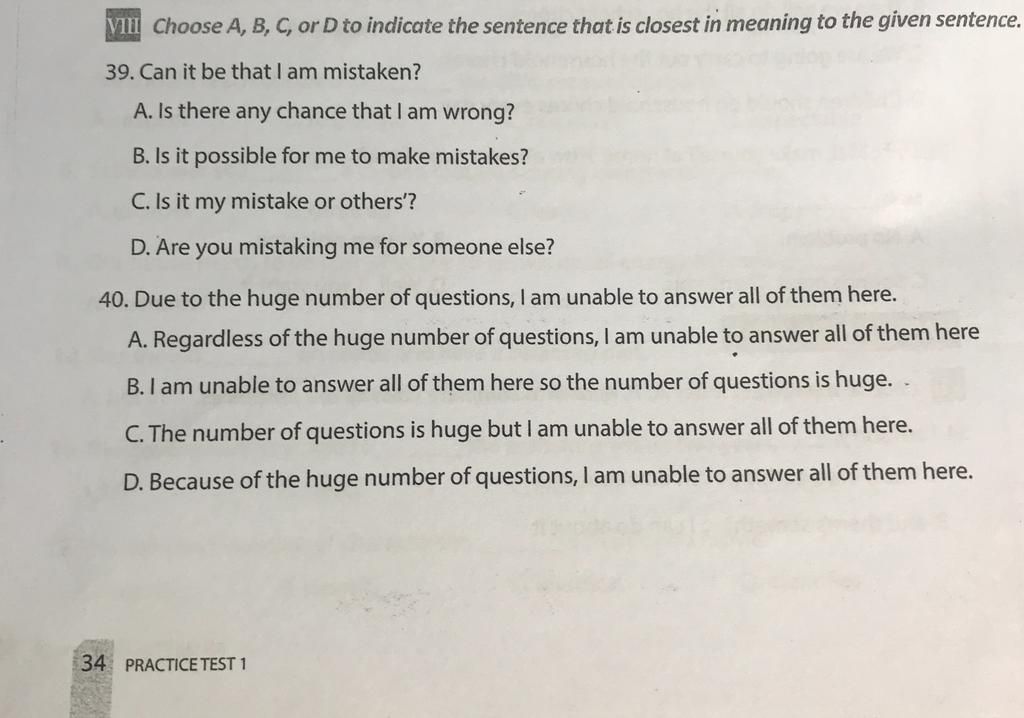 VIII Choose A, B, C, or D to indicate the sentence that is closest in meaning to the given sentence.