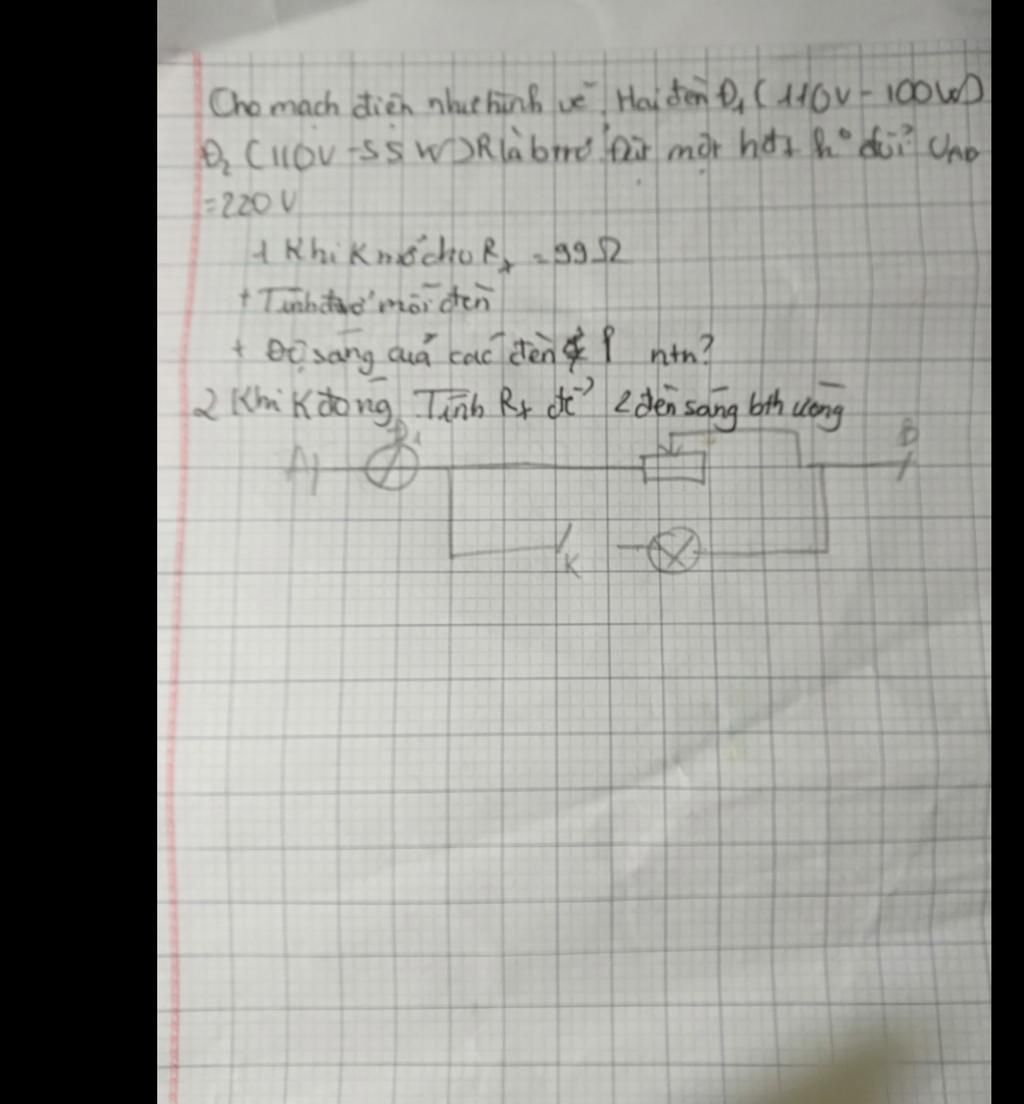 Cho mạch điện như hình vẽ. Hai đèn Đ, CH0V-100w