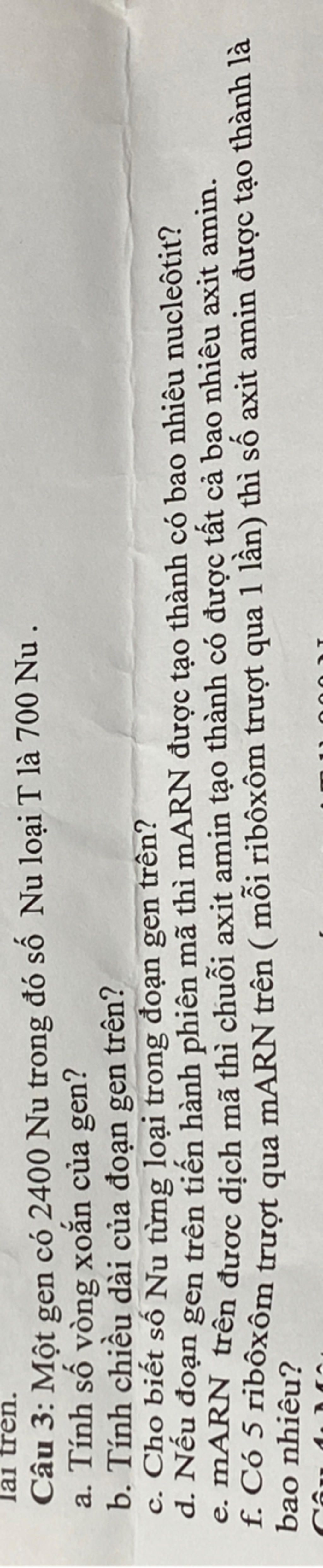 d. Số nu của mARN được phiên mã là 2400/2=1200 nu
