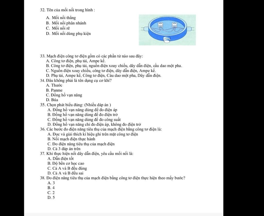33. Mạch điện công tơ điện gồm có các phần tử nào sau đây: