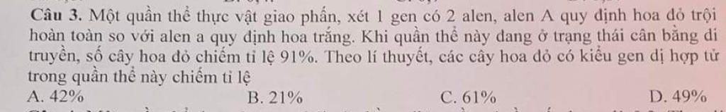 Câu 3. Một quần thể thực vật giao phấn, xét 1 gen có 2 alen, alen A quy định hoa đỏ trội