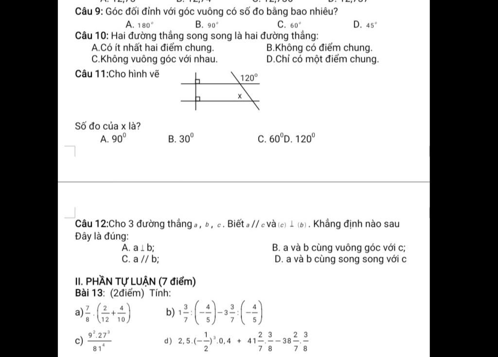 Câu 9: Góc đối đỉnh với góc vuông có số đo bằng bao nhiêu?