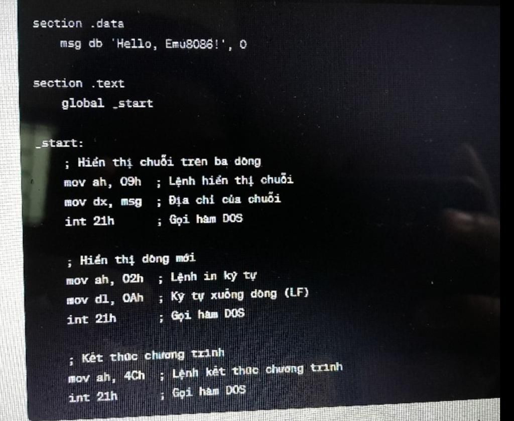Trong mã lệnh trên, chuỗi ký tự "Hello, Emu8086!" sẽ được hiển thị trên ba dòng và sau đó kết thúc chương trình.